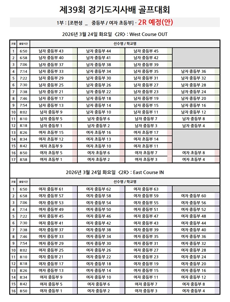 2R (3월 24일 화요일) 조편성 예정(안) 입니다.